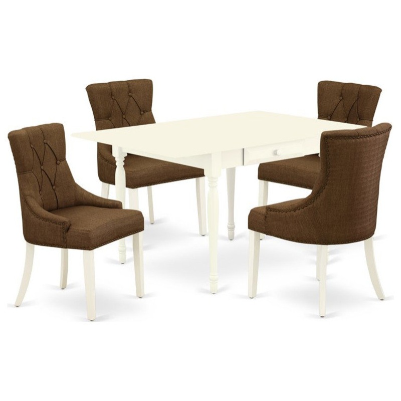 Decor your dining room with this contemporary MZFR5-LWH-18 kitchen set to get a new and polished look. Developed in the transitional style for your casual kitchen room, the dining set will be a welcome space for your friends and family to gather during meals and social activities. The suitable 5 piece wood dining table set includes a small dining table and four parson chairs. Constructed from Asian tropical hardwood commonly called rubberwood, the drop leaf table finished in Linen White has smooth edges and fashioned round legs for an elegant style. The dining table includes two 9-inch drop down leaves that provides additional space for extra food trays and drinks. The 2 drawers of the dining table amplify storage in the kitchen or dining room to help keep you organized. The dining table can be assembled without any extra tools and aim to last for long. A regal and affordable parson chairs offer a touch of beauty to any dining room and provide a sensible seating arrangement. The upholstered parsons dining chairs feature a beautiful stitched exterior. Standard back, Linen Fabric, Button tufted high-density foam padding, solid hardwood frame construction, comfortable, durable and attractive. Whether you use this parson chairs is an easy to assemble and stylish answer to your seating needs. The conventional parson gives this chair a touch of familiar charm, while the linen fabric in Dark Coffee color and clean-lined design elevate this parson dining chair with a modern flair. The standard shape, size and design make the dining area significantly attractive. This budget-friendly, durable and comfortable dining room table set can be a good choice if you are looking for a great dining time experience with your family or friends.
