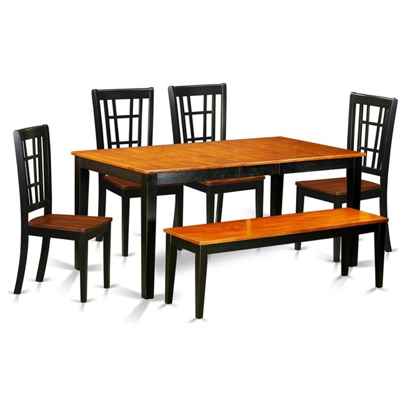-This 6 piece dining set includes table and 4 solid wood seat chairs and one bench finished in black and cherry