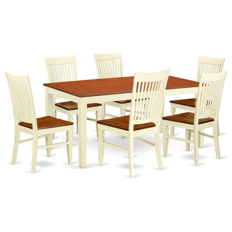 -This 7 pc dinette set with a dining table and 6 wood seat dining chairs in buttermilk and cherry