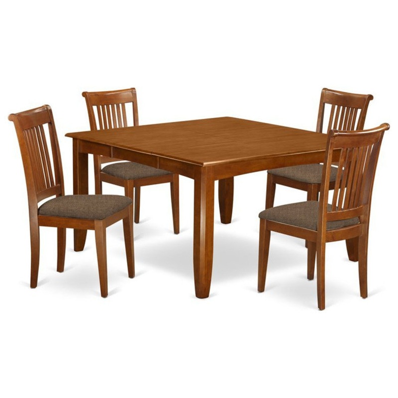 -5-piece parfait square table with 18in butterfly leaf and 4 fabric seat chairs in saddle brown finish