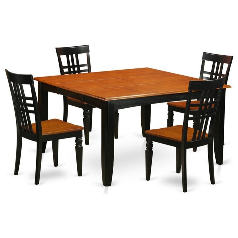 This particular dinette sets for small spaces has 5 pieces including a table and 4 dining chairs with wooden seats. This dining set includes a beautiful Black & Cherry finished Asian hardwood, known as rubber wood, with a rectangular shaped tabletop, which