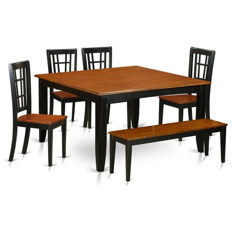 -This 6 piece dining set includes dining table and 4 wood seat dining room chairs finished in black and cherry