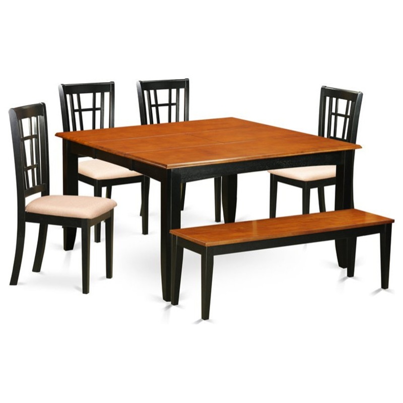This versatile dinette set can be used in the dining room or kitchen. It is constructed entirely from solid Asian hardwood featuring polished cherry-colored table tops with beveled edges and stylish Black frames and legs. The set comes with a main table and four high-back chairs plus a bench, all made to the same high quality.