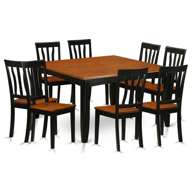 -This 9 piece dining set includes dining table and 8 wood seat dining room chairs finished in black and cherry.