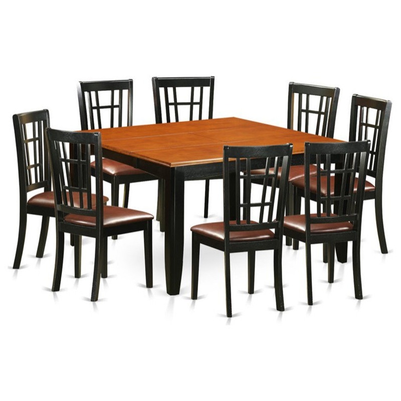-This 9 piece dining set includes dining table and 8 faux leather seat dining room chairs finished in black and cherry.