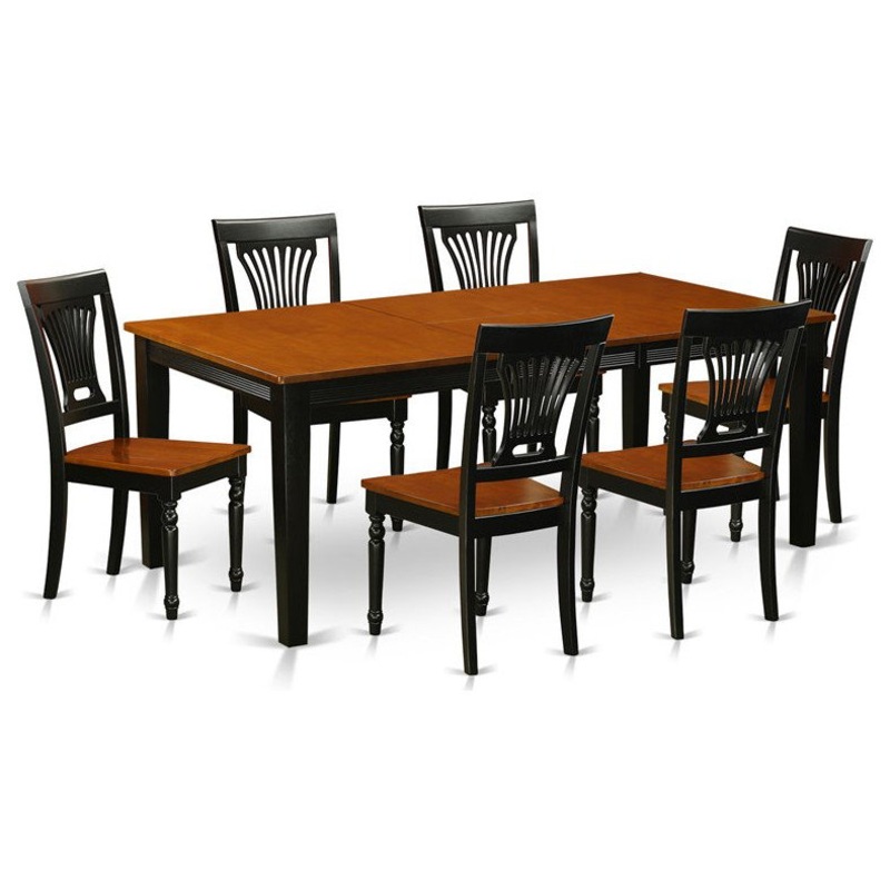 -This 7 piece dinette set includes dining table and 6 wood seat dining room chairs finished in black and cherry.