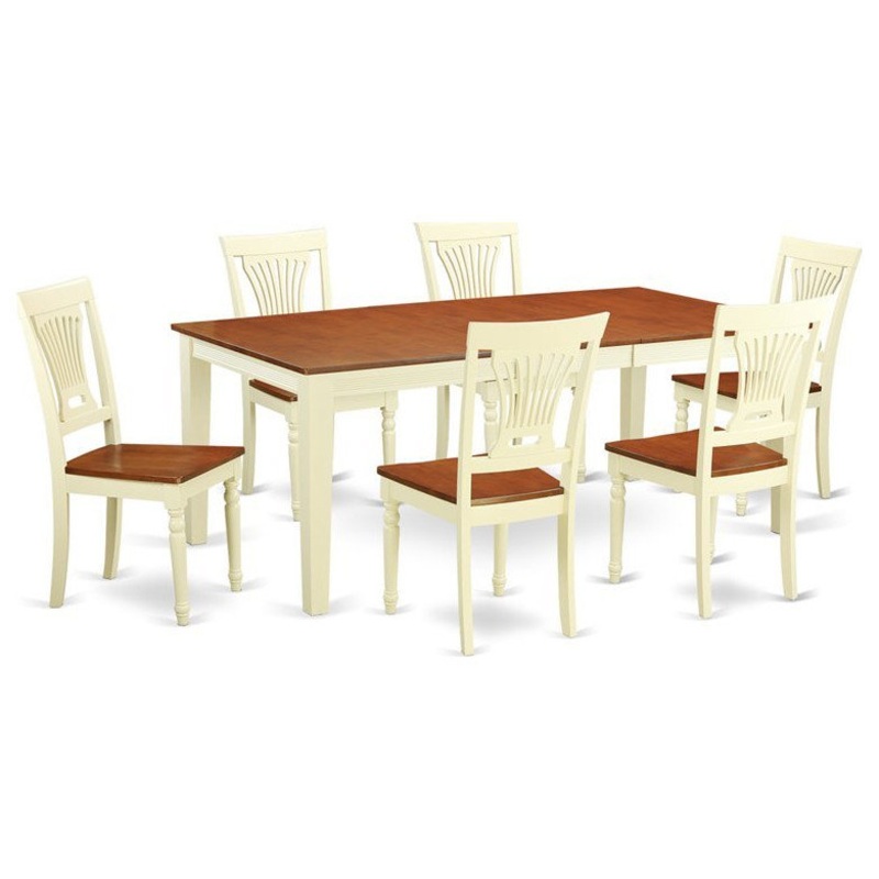 -This 7 piece dinette set includes dining table and 6 wood seat dining room chairs finished in buttermilk and cherry.