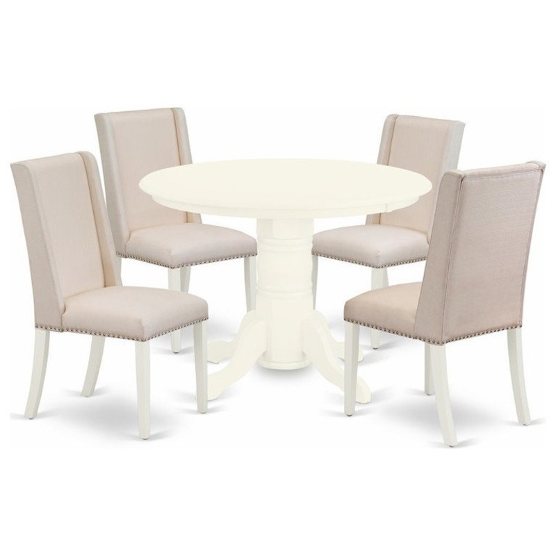 This modern dining table set includes 4 remarkable parson chairs and an awesome 4 legs dining table. The modern dining set delivers a Linen White hardwood dining room table and frame and a fantastic Cream parson chairs seat and High stylish back that bring