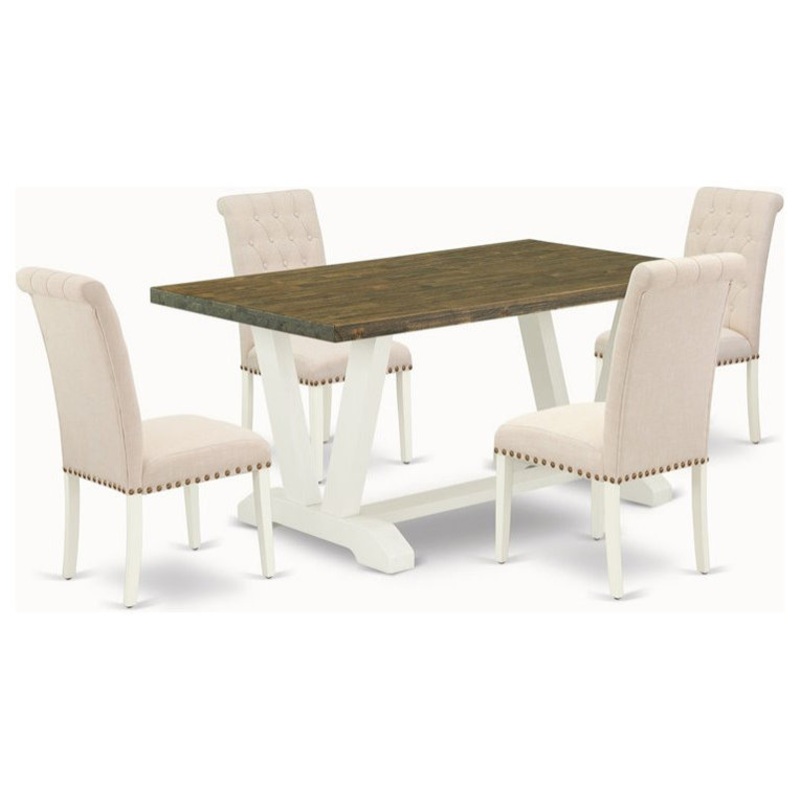 This rectangular table set includes 4 amazing Modern dining chairs and a beautiful wood table. This dining table is offered in an elegant Linen White finish. In addition, the Parson dining chairs in a Light Beige linen fabric to enhance the elegance of any