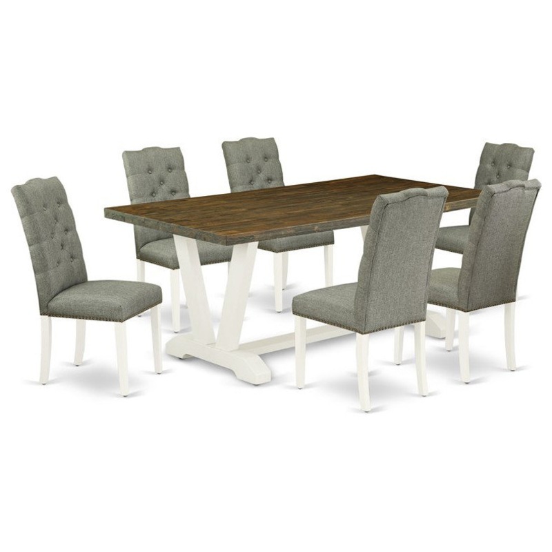 The 7-pc dinette set includes 6 parson chairs and 1 kitchen dining table. These kitchen parson chairs have a Linen Fabric seat, Button Tufted Chair Back, and the modern dining room table includes a rectangular top and Wooden Legs. The dining padded chairs