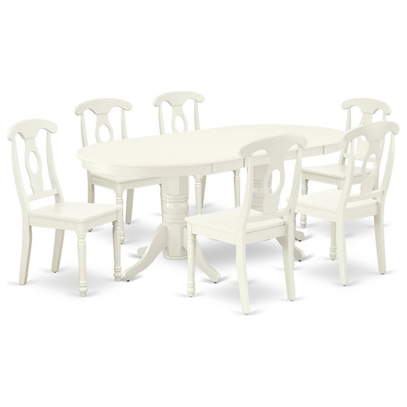 The gorgeous VAKE7-LWH-W dinette set is specifically crafted in a fashionable style with clean aspects which will direct and guide the room it occupies. The dining table with built-in self-storage butterfly leaf which fits 4 to 8 persons. Dazzling hardwood dinette table top with well-built carved pedestal support. Beveled oval shape to make welcoming kitchen space ambiance and finished in rich Linen White, the kitchen table can be acquired with hardwood or padded seat chairs. In-built self-storage butterfly leaf can be folded subtly underneath the tabletop when not being used and provides the greatest in flexibility for individuals who enjoy to set up modest, passionate dinners as well as full-out family affairs. The wooden table is created from prime quality rubber wood known as Asian Hardwood. No heat treated pressured wood like MDF, particle board or veneer top fabricated. The dining chair finished in Linen White color combined with solid wooden seat. Dining room chairs antique design will harmonize with your dining room and make certain that meals are always filled with enjoyment. Made up of hardwood, the wooden chair is stable and offers a sturdy finish. The dining room chairs add elegance and class to any place you have placed them. The frame of the dining chairs are engineered to offer a great amount of comfort to your spine and thus reduce the chances of back pain. The matching color of the chair with the table brings a good contrast in the kitchen area. The standard shape, size and design makes the dining area significantly attractive. This contemporary, budget friendly, durable and comfortable dining set can be good choice if you are looking for a great dining time experience with family and friends.