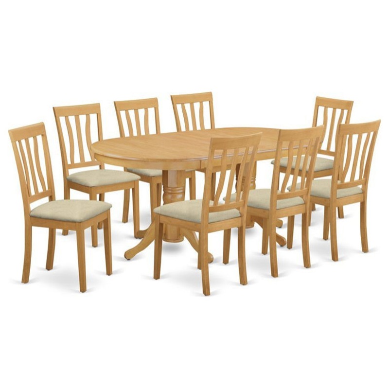-9 piece elegant dining table along with double pedestal base plus 8 dining room chairs finish in a warm oak color with linen upholstery seat.