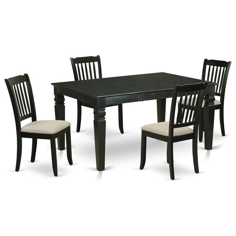Outfit your dining room in effortless style with this essential five piece WEDA5-BLK-C dinette set includes a dining table and four kitchen chairs; perfect for weekday meals and family gatherings alike. A comfortable and elegant black color offers any dining-room a relaxing and friendly feel with this medium kitchen table. The sturdy square-rectangular hybrid table stands on 4 straight solid wooden legs has plenty of space for 4-8 people to sit and enjoy their meal comfortably. The extendable leaf can be easily expanded making dining space for personal occasions or great parties. Made up of rubber wood, the most desirable Place for this particular beautiful item is dining-room or kitchen space. This eye-catching Danbury dining room chair offers a modern and sophisticated look. The kitchen chairs come with a Linen upholstery seat to fit personal preference and perfect design. This Stylish dining chair features curved front legs. Elegant dinette chairs feature 7 vertical slats to give any dining area a touch of class and sophistication. Finished in elegant Black Color. This budget friendly, durable and comfortable dinette set can be good choice if you are looking for a great dining time experience with your family or friends.
