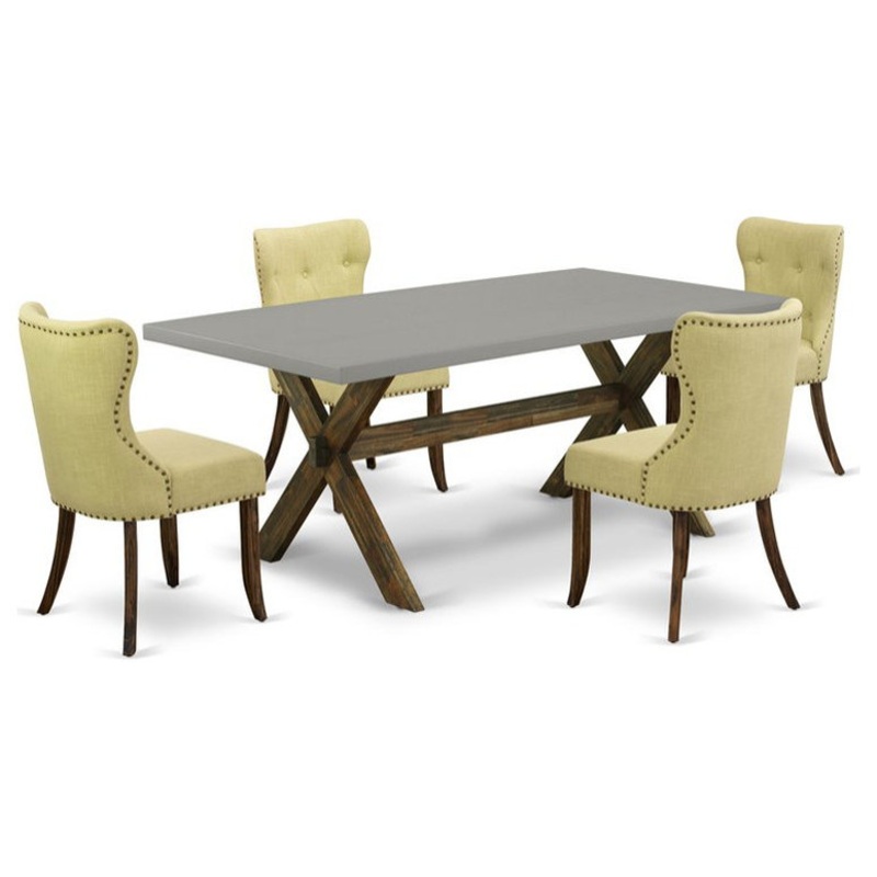 When it comes to picking furniture, your kitchen room table set needs just as much thought as your dining area. This 5-PIECE dining room set provides 4 parson chairs and a modern kitchen table. These dining room chairs have Linen Fabric, Button Tufted chair back. This dining room table set is constructed from superior quality Asian wood. Our dining chairs with Linen Fabric and offer the Button Tufted chair back feature in a Limelight color. These parson dining chairs have Distressed Jacobean finish in the chairs legs. The finish on the wooden dining table top is Cement with a solid Distressed Jacobean base. These padded parson chairs are easy to build. In addition, this kitchen chair wood frame and Linen Fabric are extremely easy to clean. All you need is a slightly damp cloth to clean any dust. The traditional design of these parson dining chairs fits perfectly with any decor.