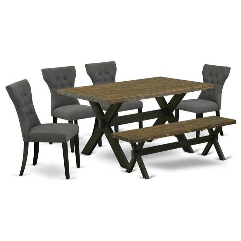 This modern dining table set includes 4 wonderful Upholstered Dining Chairs, a beautiful indoor bench, and an outstanding wood table. This wood table is offered in an elegant Wire Brushed Black finish. In addition, the Parson dining chairs in a Gotham Gray
