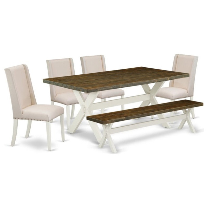This dinette set includes 4 gorgeous Parson Chairs, a wonderful indoor bench, and an awesome dining room table. This dining room table is offered in an elegant Linen White finish. In addition, the Parson dining room chairs in a cream linen fabric and wonderful Distressed Jacobean dining room bench top to enhance the elegance of any kitchen or dining area. Our modern dining table set provides great durability because this wood table and wooden bench is built from high quality Asian Wood which can bear the weight of 3 Lbs. We have created these Modern dining chairs and rectangular table, wood bench with the help of highly experienced carpenters, who generate a smooth and high-end finish to this dining room table set. We try to offer innovative as well as easy to assemble products. Our high-quality modern dining table set is perfect for you and your beautiful dining area as well as the kitchen area. You can use it for casual home parties or for intimate gatherings. Keep enjoying East West modern furniture!