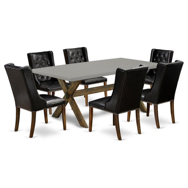 Our sophisticated 7-Piece dining room table set is going to make your family mealtime more comfortable and pleasant! Our 7 Piece dining room set includes 6 dining room chairs, 1 wooden dining table. These Button Tufted-Back chairs are slightly and elegantly curved, expertly finished with PU leather soft upholstery. Our kitchen chair seat is created from PU leather that offers a wonderful sitting experience. This wooden table has a rectangular Cement tabletop and Distressed Jacobean X-Style Legs. These nail head dining room chairs have Black PU leather and Distressed Jacobean solid wood chair legs. This padded chair stands on a sturdy solid wood frame with solid legs and a contemporary Distressed Jacobean finish. Designed with easy and fast assembly in mind, each set comes conveniently flat packed with easy to follow instructions and all necessary tools included. This contemporary, budget-friendly, durable and comfortable dining room set furniture can be a great choice for you and your family if you enjoy the dining experience. Enjoy with East West Furniture!