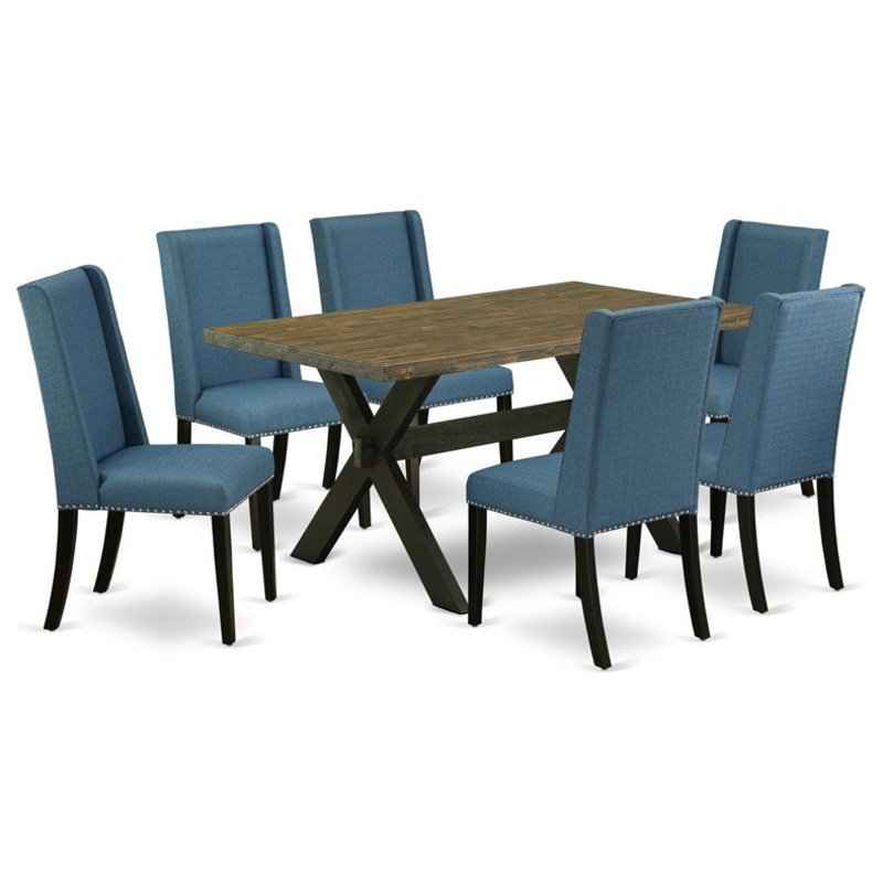 This dining set includes 6 awesome upholstered dining chairs and a wonderful dining room table. This rectangular dining table is offered in an elegant Wire brushed Black finish. In addition, the dining chairs in a Mineral Blue linen fabric to enhance the elegance of any kitchen or dining area. Our rectangular dining room table set provides great durability because this rectangular table is built from high quality Asian Wood which can bear the weight of 3 Lbs. We have created these padded parson chairs and a rectangular dining table with the help of highly experienced carpenters, who generate a smooth and high-end finish to this dining table set. We try to offer innovative as well as easy to assemble products. Our high-quality kitchen set is perfect for you and your beautiful dining room as well as the kitchen area. You can use it for casual home parties or intimate gatherings. Keep enjoying East West modern furniture!