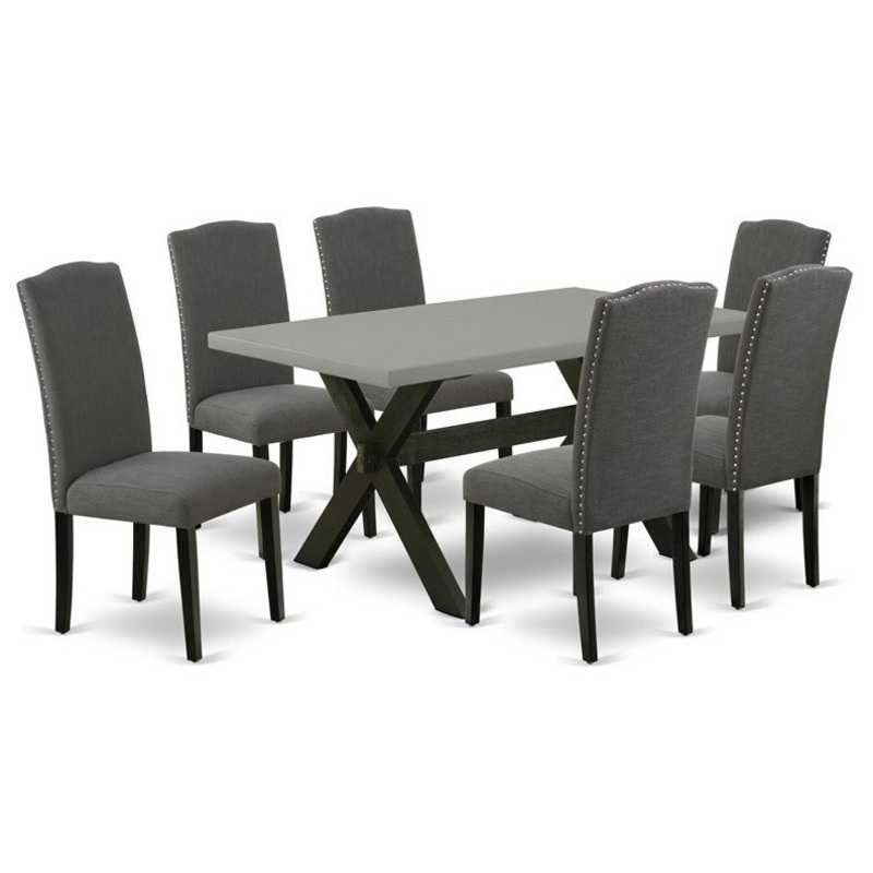 -Cement finish wood dining table top and dark Gotham gray fabric seat give enough support up to 3 lbs