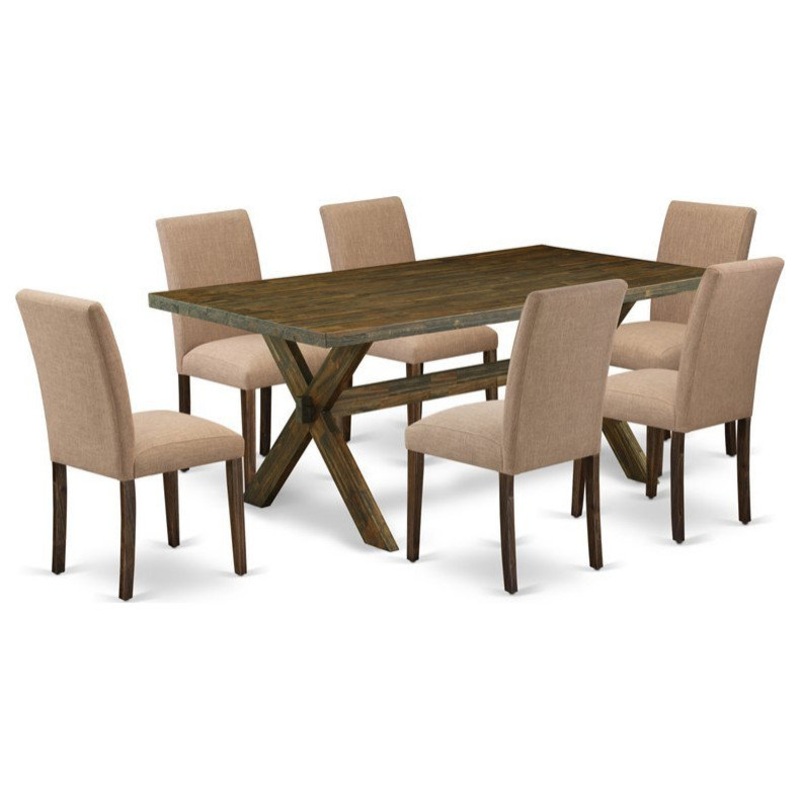 This dinette set consists of 6 kitchen chairs and a rectangular dining table. This wood dining table has a rectangular top and 4 beautiful X legs. The modern dining table has a Linen Fabric seat and a stylish high back. The seat of our dining chairs provides a good sitting experience and a stylish high back to fit your Back Perfectly for the backrest. Mid-century, modern dining chairs in this dining area consist of 4 legs. The color of the mid-century modern dining chairs is the light Sable and the wooden legs are Distressed Jacobean. The top color of the modern rectangular dining table is Distressed Jacobean and the wooden X legs are Distressed Jacobean. The modern dining table set is created from solid wood. This wood is also called rubber wood. This wood always gives durability and strength. This rectangular table and Dining chairs more balance with the help of legs because this is made of rubber wood. Make your complete kitchen dining table set stronger. You can use this dinette set for a long time. You can move our Dining room chairs under the modern dining table when you finish your meal. Easy to assemble these Parsons dining chairs and wooden dining table. You only need to take about 5-6 minutes to assemble each dining room table set. This dining table set came with all the tools necessary. This kitchen and dining room chairs clean easily because this dinette set design has smooth. You can easily clean this set with any brush and dust cleaner cloth. You can clean this dining room set within a few minutes. This kitchen dining table set is matched with any room decor because of its style. This dinette set gives always-fresh look and attracts any person who comes to your home.