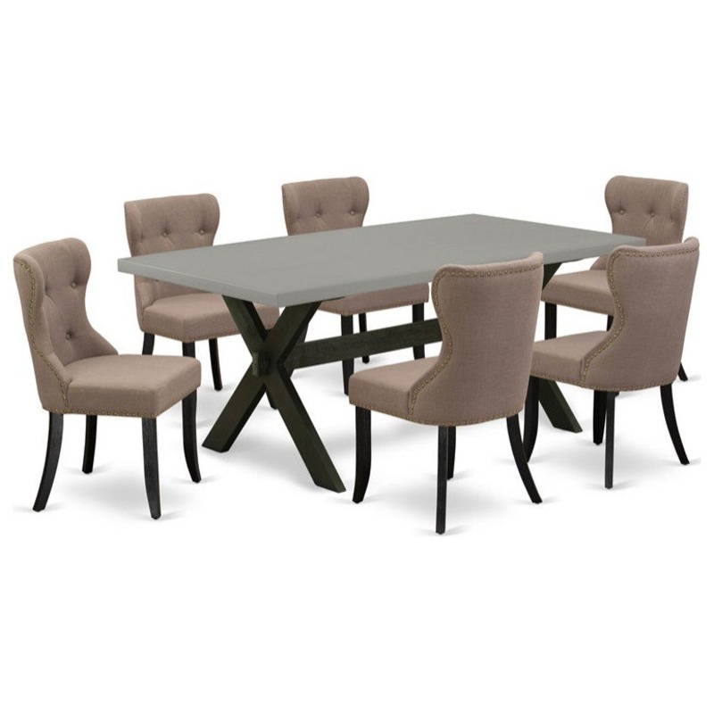 Our 7-piece modern dining table set includes 6 kitchen chairs and 1 rectangular dining table. These dining chairs have a Linen Fabric seat, Button Tufted Chair Back, and the rectangular dining table includes a rectangular top and Wooden Cross Legs. The par