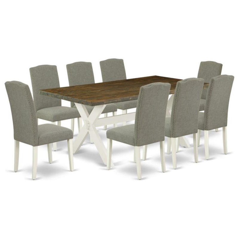 This dining room set includes 8 gorgeous parson chairs and a gorgeous wood table. This dining room table is offered in an elegant Wire brushed Linen White finish. In addition, the parson dining room chairs in a Dark Shitake linen fabric to enhance the elegance of any kitchen or dining room. Our dining room set provides great durability because this wood dining table is built from high quality Asian Wood which can bear the weight of 3 Lbs. We have created these parson dining room chairs and wood dining table with the help of highly experienced carpenters, who generate a smooth and high-end finish to this modern dining table set. We try to offer innovative as well as easy to assemble products. Our high-quality kitchen table set is perfect for you and your beautiful dining area as well as the kitchen area. You can use it for casual home parties or for intimated gatherings. Keep enjoying East West modern furniture!