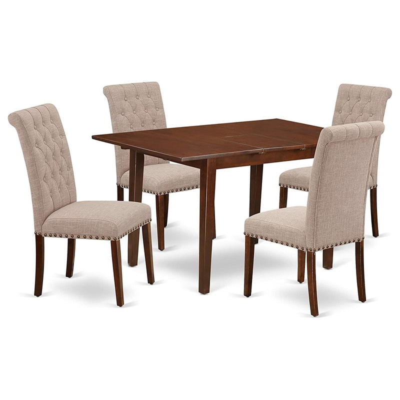-5 piece dining Set includes a small rectangular dining table and 4 parson chairs. -Classy Mahogany Finish dining Set Let you enjoy a nice and trendy dining experience and blends well with any room dcor. -This rectangular wooden table is made up of high Qu