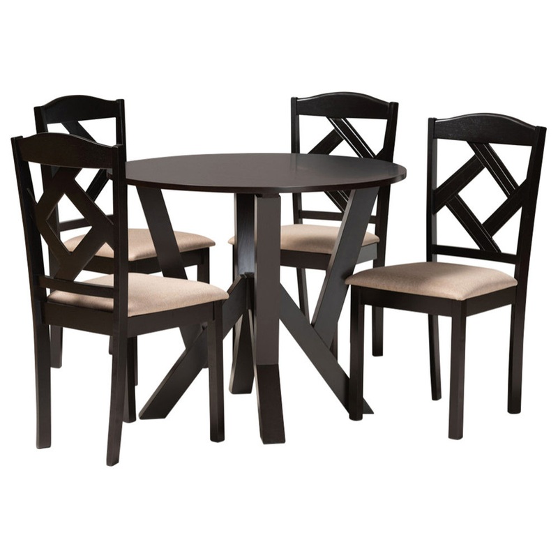 Enjoy everyday meals and host friendly gatherings with the Elissa 5-piece dining set. Made in Malaysia, this set includes four dining chairs and one table constructed from wood displaying a rich espresso brown finish. Each chair features a plush foam padded seat upholstered in soft fabric along with a geometric cut-out design on their backs for a striking blend of comfort and style. Requiring assembly, the wide, circular tabletop of the Elissa ensures ample elbow room for each member of the table. Perfect for enjoying nights with friends and family, the Elissa dining set elevates any dining experience.