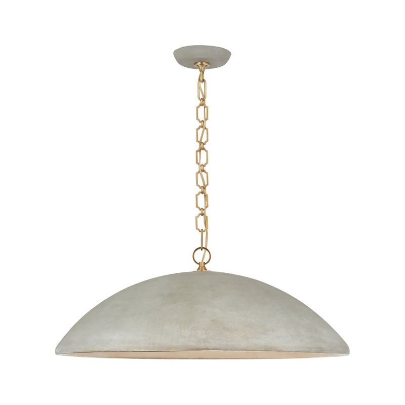 The Elliot Large Pendant brings a soft, distressed feel to an array of stylish spaces. The semi-spherestone shade paired with the delicate brass chain provides the perfect contrast of materials and combination of rustic and glam.This pendant provides just