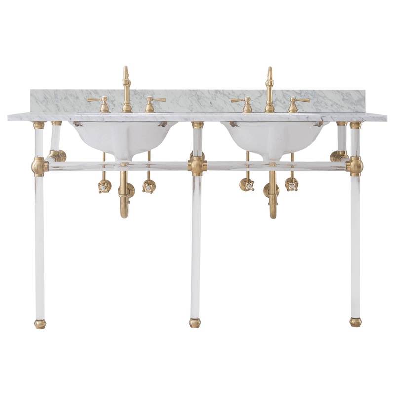-A classically inspired washbasin console, Empire Collection, enhances contemporary beautification into a sophisticated bathroom. Copper joints and acrylic stand melding for a cohesive whole, this Carrara white marble console with crystal clear acrylic stand and smooth white ceramic sink is a perfect match for a miniature bathroom. An accessible bar across the front of deluxe, substantial acrylic legs not only improves stability but also provides a location from which is perfect for hanging towels and toiletries. Suitable for applications both contemporary and traditional, this artful design retains the harmony between proportions and its timeless charisma.