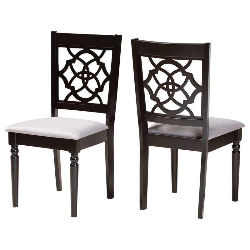 Elegant design marries quality craftsmanship in the Ernst dining chair. Made in Malaysia, the Ernst is constructed from solid wood and showcases a rich dark brown finish that complements the grey fabric upholstery. Ample dining comfort is provided by the plush, foam padded seat. Requiring assembly, the back features a unique cut-out design that allows light to flow through, providing a more open feel in tight spaces. Ring-turned legs add a classic, refined touch. Well suited for both casual meals and formal dinner parties, the Ernst dining chair enhances any dining experience.