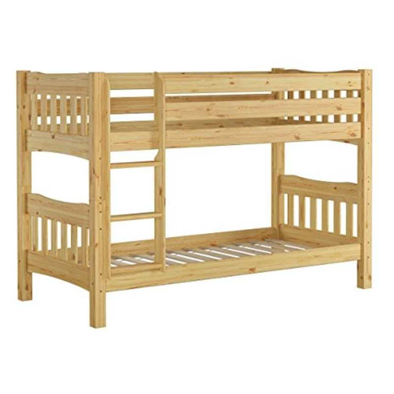 Dettagli: Letto a castello di solido legno di Pino laccato.Di alta qualit adatto per bambini, giovani, ragazzi ma anche adulti, collegi, ostelli.Con scaletta e bordo anticaduta in assi di legno.Il letto divisibile in due letti singoli non perfettamente uguali.Doghe rigide incluse.(Senza materassi e decorazioni)Na… turale !Descrizione:Letto di solido Pino nativo di qualit, pregevole fattura,molto stabile.Il legno proviene da foreste europee, gestione sostenibile senza inquinanti.La minuteria metallica facilita la costruzione e garantisce robustezza.La scaletta di circa (44 cm) pu essere assemblata sia a destra che a sinistra.La protezione superiore anti caduta alta circa 40 cm.Dimensioni:Superfici d’appoggio/materassi: 90 x 200 cmDimensioni esterne: circa 100 x 209 x 144 cm ( largo x lungo x alto )Spessore zampe: circa 6,8×6,8 cmSpessore assi: circa 2 x 11 cmAltezza nicchia: circa 70 cmAltezza da terra circa 19 cmProfondit inserimento: circa 8 centimetriPortata Max statica: 100/80 kg (Basso/Alto)A disposizione anche cassettoni porta oggetti 90.10-S1 o 90.10-S2, e cassettone terzo letto ospiti 90.10-S7.Questo letto a castello anche per ADULTI.Alcune foto pi ricche di addobbi non corrispondono all’offerta !Sono di arricchimento.