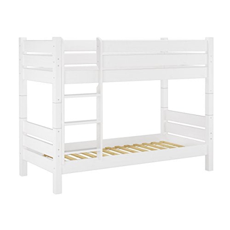 Dettagli: Letto a castello di solido legno massello di Pino colore bianco.Di alta qualit adatto per alberghi, appartamenti, ostelli, collegi etc.Con scaletta e bordo anticaduta in assi di legno.Divisibile in due letti singoli.Doghe rigide incluse(senza decorazioni)Na… turale !Descrizione:Letto di solido Pino nativo di qualit, pregevole fattura,molto stabile.Il legno proviene da foreste europee, gestione sostenibile senza impurit.I raccordi metallici facilitano la costruzione e solidit.La larga scaletta di circa (48cm) pu essere assemblata sia a destra che a sinistra.la protezione superiore anti caduta alta circa 43 centimetri.Si prega di notare che i montanti del letto sporgono nella superficie del materasso.Per i materiali morbidi come i materassi in schiuma ecc. questo non un problema.Tuttavia, le reti a doghe in una struttura con telaio o i materassi con molle metalliche potrebbero dare problemi.Dimensioni:Superfici d’appoggio/materassi: 80×200 cmDimensioni esterne: circa 92x210x160 cm ( Largo/lungo / Alto)Spessore zampe: circa 6,8×6,8 cmSpessore assi: circa 2,9 cmAltezza nicchia: circa 80 cmProfondir inserimento: circa 8 centimetriPortata Max: 120/100kg (Basso/Alto)Questo articolo disponibile nelle seguenti taglie/superfici di appoggio:80/90/100 x 190 cm80/90/100 x 200 cm80/90/100 x 220 cmDisponibile anche naturale laccatoDisponibile con nicchia da:circa 100 cmAttenzione prego !Le foto pi ricche di dettagli (camera-coperte-cuscini etc) potrebbero essere solo dimostrative, non facenti parte dell’offerta.