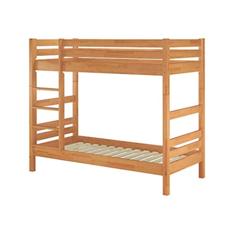 Dettagli: Solido e bel letto a castello di solido legno di Faggio.Di alta qualit adatto per alberghi, appartamenti, ostelli,collegi etc.Con scaletta e bordo anticaduta in assi di legno.Divisibile in 2 letti singoli non perfettamente uguali.Con doghe rigide(Senza materasso e decorazioni)Na… turale !Descrizione:Letto di solido Faggio nativo di qualit, pregevole fattura,molto stabile.Il legno proviene da foreste europee, gestione sostenibile senza impurit.Gli inserti metallici facilitano la costruzione e garantiscono robustezza.La larga scaletta montata a sinistra.La protezione superiore anti caduta alta circa 43 centimetri.Il letto divisibile in due letti singoli.Dimensioni:Per materassi 90 x 200 cmDimensioni esterne: circa 100 x 208 x 177 cm ( Largo / lungo / alto )Altezza nicchia: circa 100 cmSpessore zampe: circa 62 x 62 mmAssi spesse: 23 x 135 mmLarghezza scala: circa 44 cmBordo inferiore del letto: circa 34 cmSuperficie superiore del bordo del letto: circa.146 cmProfondit di inserimento: circa 10 cmAltezza libera dal suolo: circa 21 cmPesi garantiti circa 120/100 kg (sotto / sopra)Su richiesta il cassettone porta oggetti 90.10-B01I materassi di diversa qualit possono essere selezionati dalla VOCE Materasso.La consegna viene fornita smontata.Alcune foto pi ricche di addobbi non corrispondono all’offerta !Sono di arricchimento.