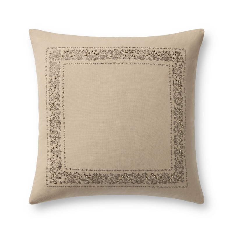 This throw pillow from Rifle Paper Co. x Loloi features an embroidered botanical frame design based on original artwork by Anna Bond. The pillow is machine-embroidered in India of 100% cotton.
