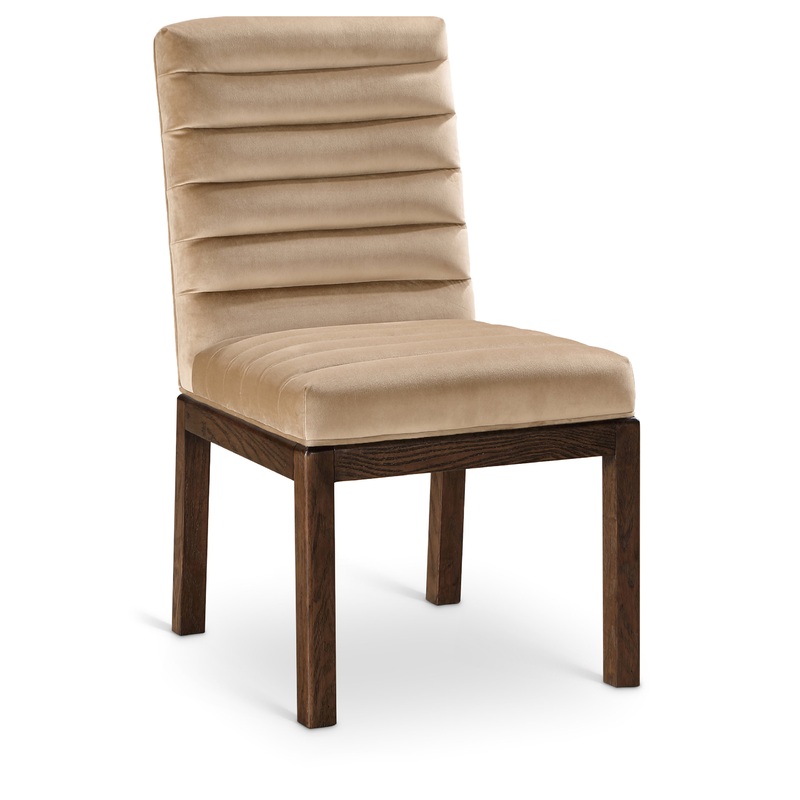 Transform your dining area with the Evelyn dining chair, featuring luxurious beige velvet upholstery. Supported by rich walnut brown ash wood legs and detailed with deep channel tufting, this chair exudes both durability and opulence. The 460 GSM velvet of