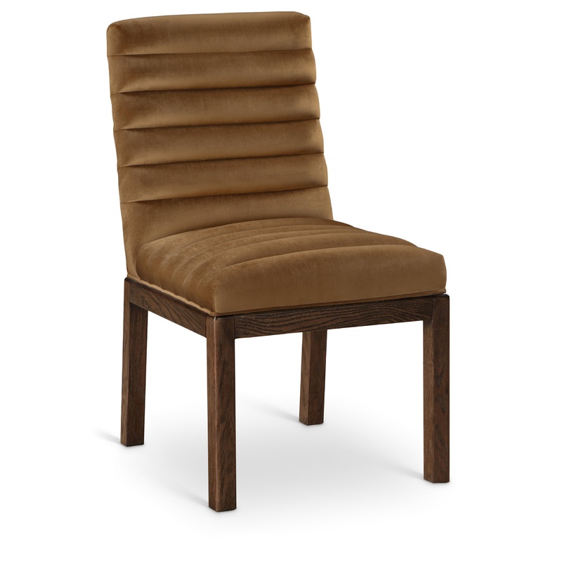 Transform your dining area with the Evelyn dining chair, featuring luxurious saddle velvet upholstery. Supported by rich walnut brown ash wood legs and detailed with deep channel tufting, this chair exudes both durability and opulence. The 460 GSM velvet o