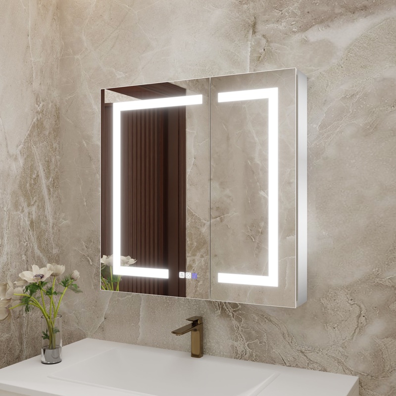 Upgrade your bathroom with the 3 Touch Switch LED Lighted Medicine Cabinet with Mirror. This versatile cabinet can be recessed or surface mounted, saving space and providing a streamlined look. Its stepless dimming feature allows for customized brightness and color temperature, while the advanced defogging technology ensures a clear mirror surface. The mirrored glass shelf adds extra storage space and the built-in sockets provide easy access to electrical appliances. Easy to install and high quality.