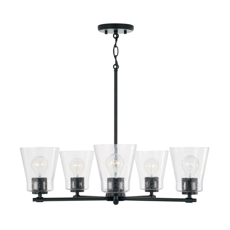 Specifications for this Capital Lighting Five Light ChandelierWidth: 27.00"Height: 7.75"Length: 27.00"Weight: 10.00 lbChain: 6`Wire: 72"Canopy: 5"Light InformationLight Bulbs and/or Light Source are not included.Unsure what bulbs to add to your order? Emai