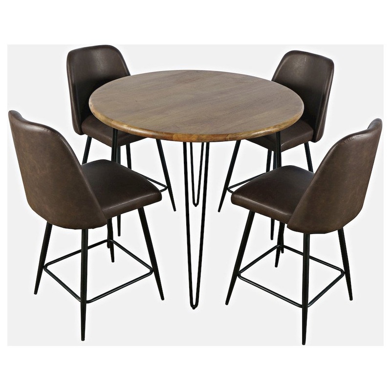 Stunning and unique, the Brennan Five Piece Counter Height Dining Set is a wonderful mix of beautiful solid hardwood and modern style. Its round shape, boasting a 42 diameter, exudes a sense of inclusivity, encouraging lively conversations and fostering a