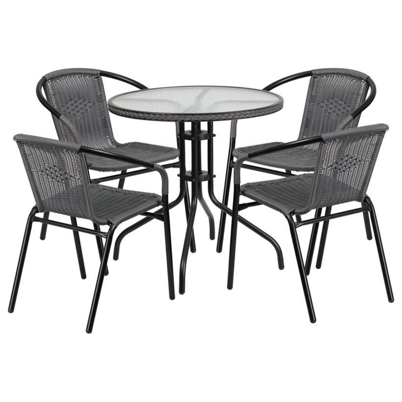 Arrange your perfect outdoor space with this glass table set. This set will enhance your bistro, cafe, restaurant, hotel or home patio space. The rippled designer glass top has a smooth surface for keeping items level. The rattan edge band adds just the ri