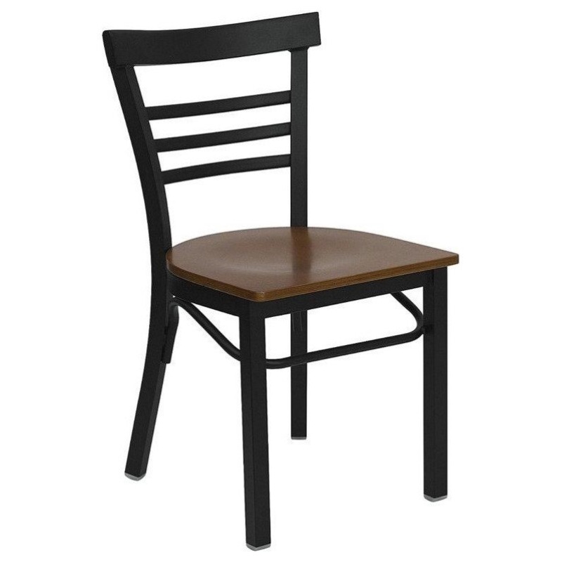 Create a first-rate dining experience by offering your patrons great food, service and attractive furnishings. Metal chairs are a popular choice for furnishing restaurants, lounges, bars and other high traffic establishments. This dining chair is easy to clean, which is an important aspect when it comes to a business. Built to withstand the everyday hustle and bustle in the restaurant and hospitality business, these dining chairs will also look great in your home. The beautiful cherry wood seat and three-slat ladder back design will keep guests comfortable. The frame is stabilized using welded joint assembly and a curved support bar. The floor glides help protect your floors and ensure smooth gliding. Use this chair in your kitchen or dining room to give your decor a fresh look. The simple and lightweight design of this chair is a must have, whether used in the home or your commercial business.