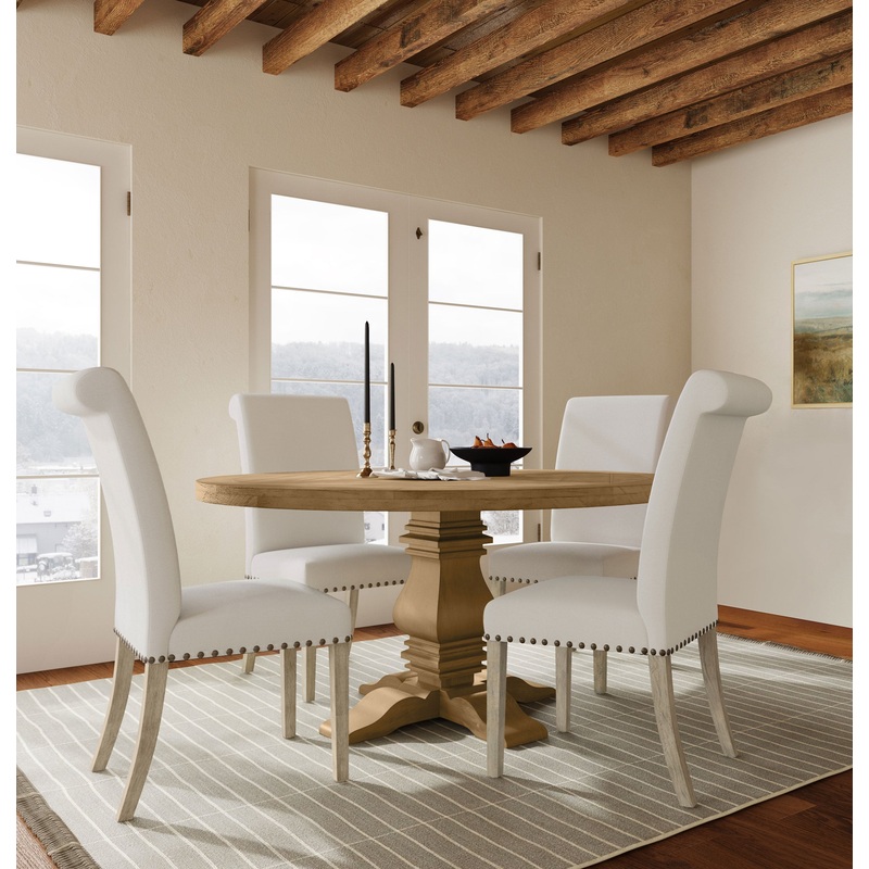 Build a gathering space you’ll love around a traditional five-piece dining set. Featuring a rustic smoke wood finish, the set includes a round table for family dining. The table offers a stylish presentation, complete with a gently rounded tabletop edge and a decorative pedestal that stands out in any setting. Complete the set with four side chairs featuring beige upholstery, tall rolled backs, and foam cushioning for comfort. The seat edge is adorned with beautiful nail heads along the bottom, adding an extra touch of elegance to the set.