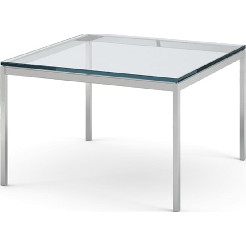 As a pioneer of the Knoll Planning Unit, Florence Knoll created what she modestly referred to as the fill-in pieces that no one else wants to do. Her Square End Table (1954) has the simple architectural lines and unparalleled construction of all modern classics. Its topped with glass or solid marble and stands on a polished chrome base. Made in Italy.