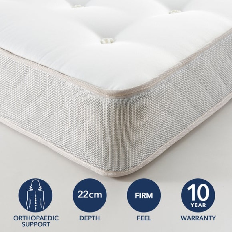 12.5g open coil bonell springButterfly edge to edge support to provide extra stabilityDual sided use to prolong mattress lifeRecycled polyester fillingsQuilted box borderNo handles and no ventsHand tuftedVery firm supportThe Fogarty Firm Open Coil Mattress