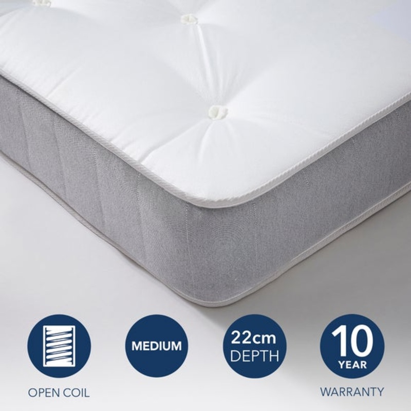 Open CoilMedium Support recommended for front & back sleepersEco Flex Layer protective and comforting recycled textiles layerDouble the Filling gives the mattress extra comfortHand Tufted holds filling in place for consistent supportHypoallergenic CoverFli