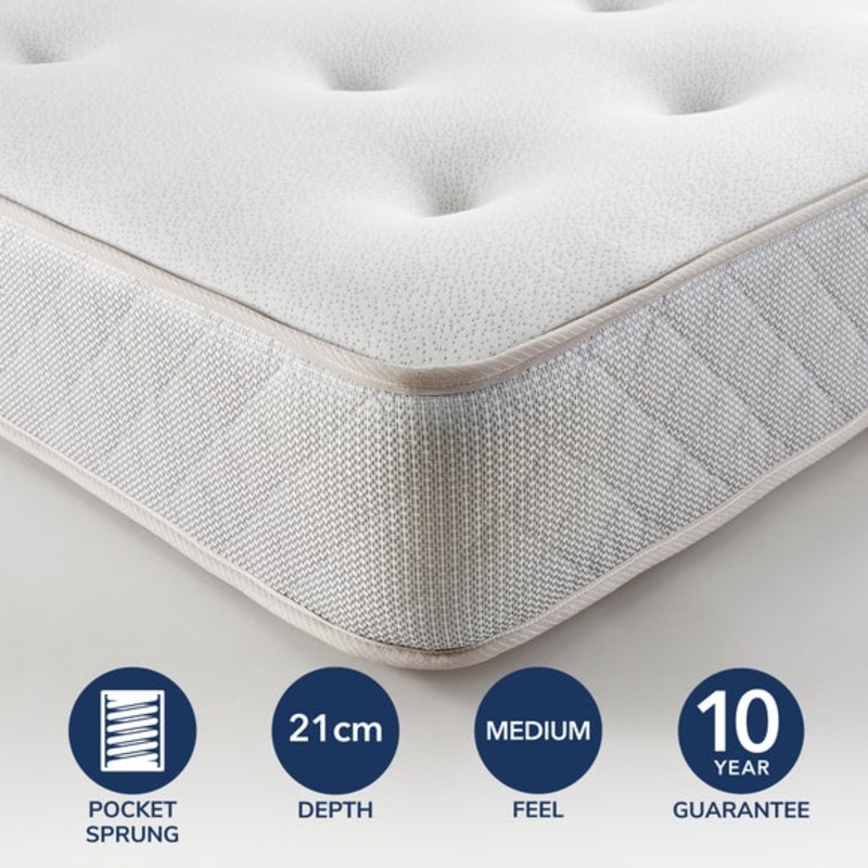 Elevate your sleep with the Fogarty Just Right Memory Foam 1000 Pocket Sprung Mattress. Featuring 1000 pocket springs that respond individually to movement, this single-sided marvel is hand-tufted for extra support. The recycled polyester fillings and memory layer provide exceptional comfort, while the quilted box border adds a touch of sophistication. Enjoy medium support without handles and vents, with the added benefit of a spring insulator pad for an undisturbed night’s sleep.