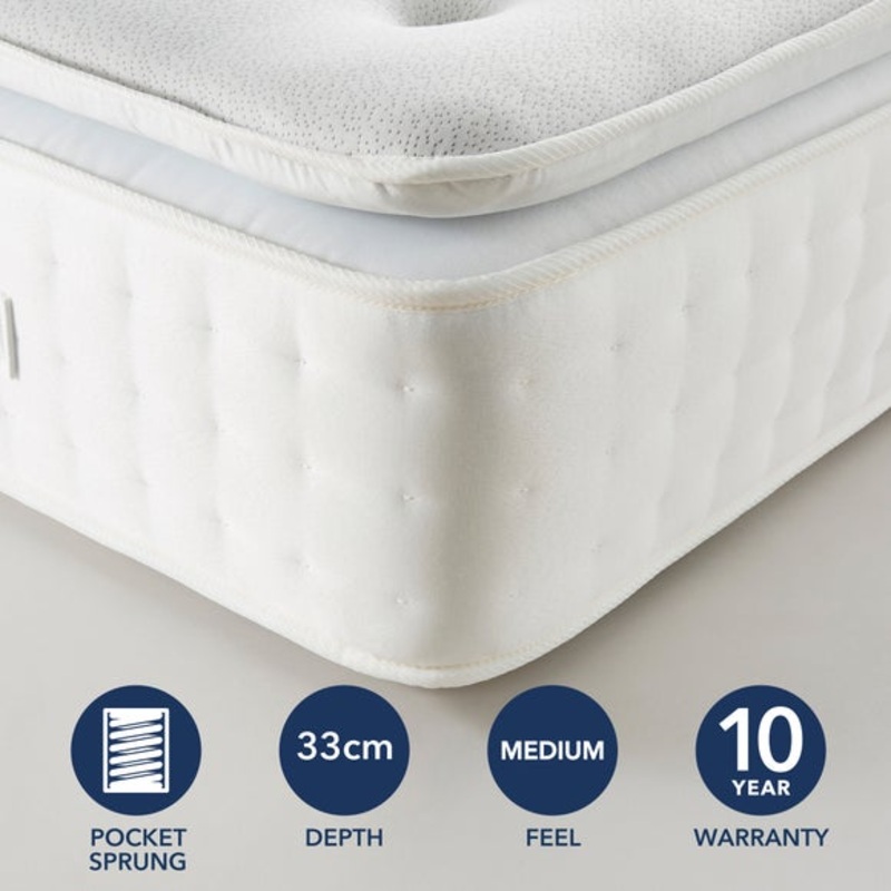 1000 pocket springs which respond individually to movement and prevent any sleep disturbancesSingle sided mattressHand tuftedRecycled polyester fillingsMemory pillow top which adds extra comfort and cushioning and moulds around the body3 row simulated stit