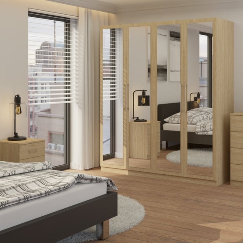 Keep everything organised and tidy with ease with this Foster 4 door wardrobe. Designed in a contemporary style, with a choice of oak effect or dark grey anthracite finishes and modern metal bar handles, this wardrobe does not compromise on looks whilst providing spacious and flexible storage. The shelves and hanging rails are adjustable to suit your needs – the perfect addition to a modern bedroom.