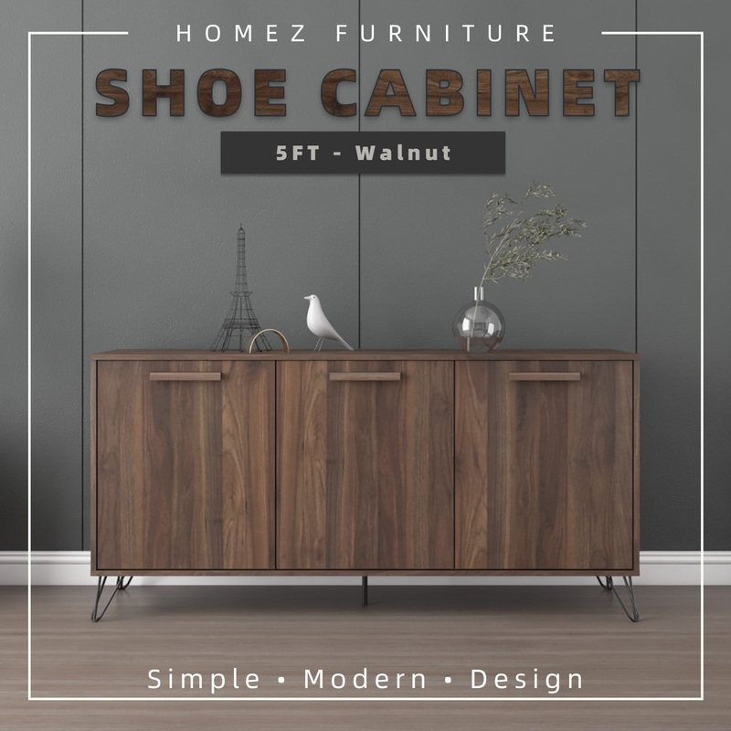** - /Shoe (-)**- Material: Particle Board with 3D PU paper- Metal Leg Frame- Modern Simple Walnut Colour- Extraordinary Woodgrain- Display Cabinet with 3Doors + 6 Shelves- Product Dimension: L149 x W40 x H72.4cm** - (-)**- Material: Particle Board with 3D